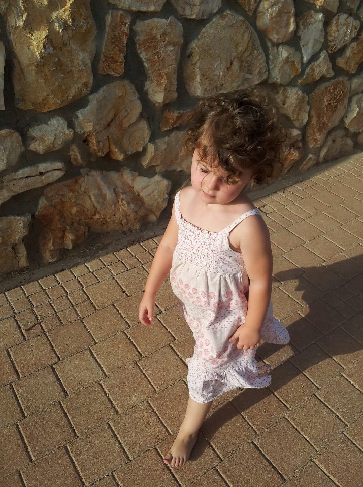 My barefoot daughter walking along the sidewalk of our kibbutz